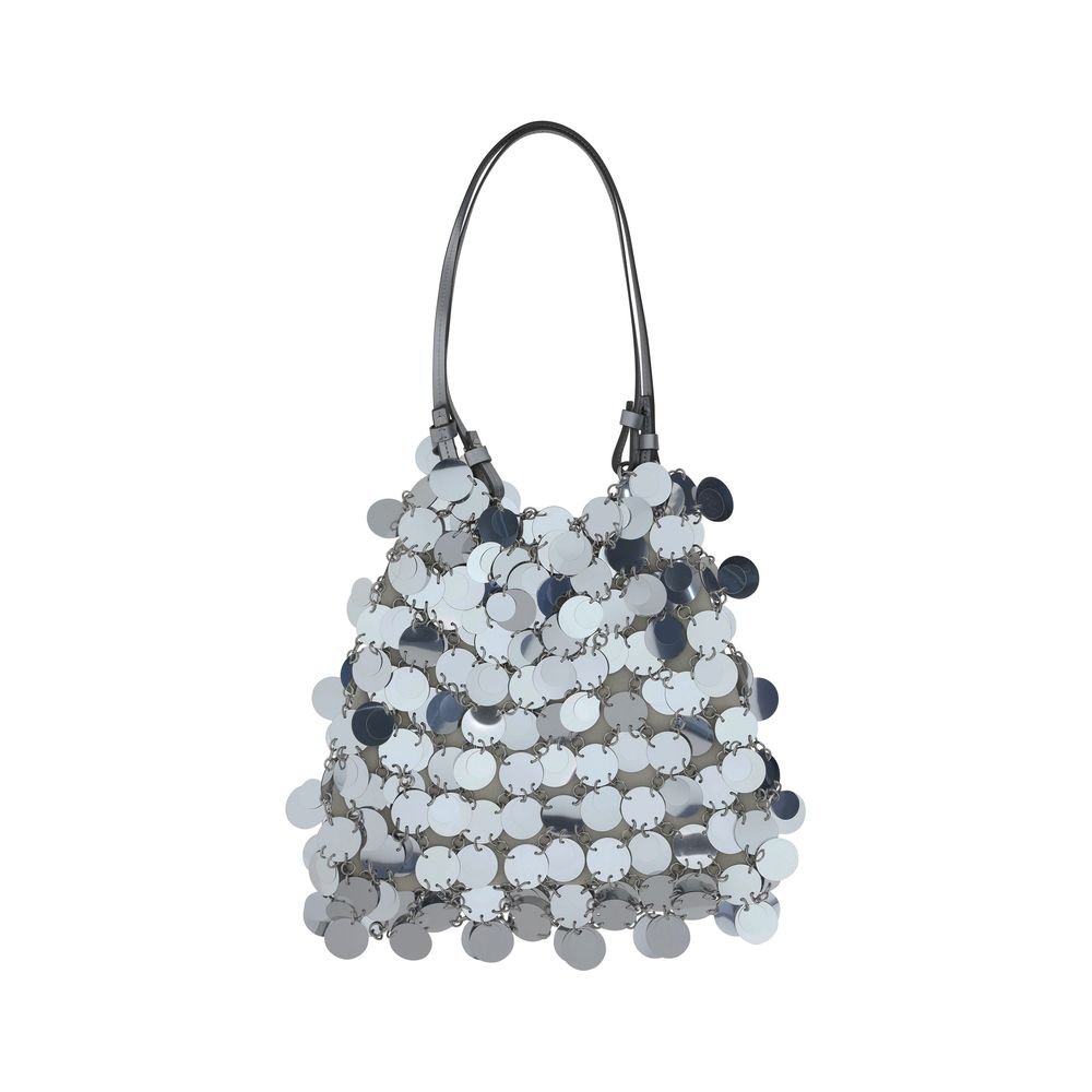 Handbag by Paco Rabanne, design consisting of iconic all-over applied metallic mirrors, double slim handles made of leather at the top, pouch design, open top, charm with iconic brand logo applied at the base of the handles.